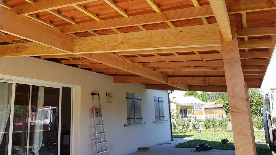 Ici nous avons réaliser pour notre client de Saint Laurent Médoc une avancée traditionnelle en bois Douglas de 9X4 tailler et assemblée sur chantier.La couverture à était réaliser en tuile Romane canal vieilli Languedoc poser sur liteaux 27x32 traité classe 2.Nous avons également installer des tuiles de verre en toiture pour réaliser un puits de lumière et ainsi éviter que leur pièces de vie ne sois trop sombre les jours d'hiver.