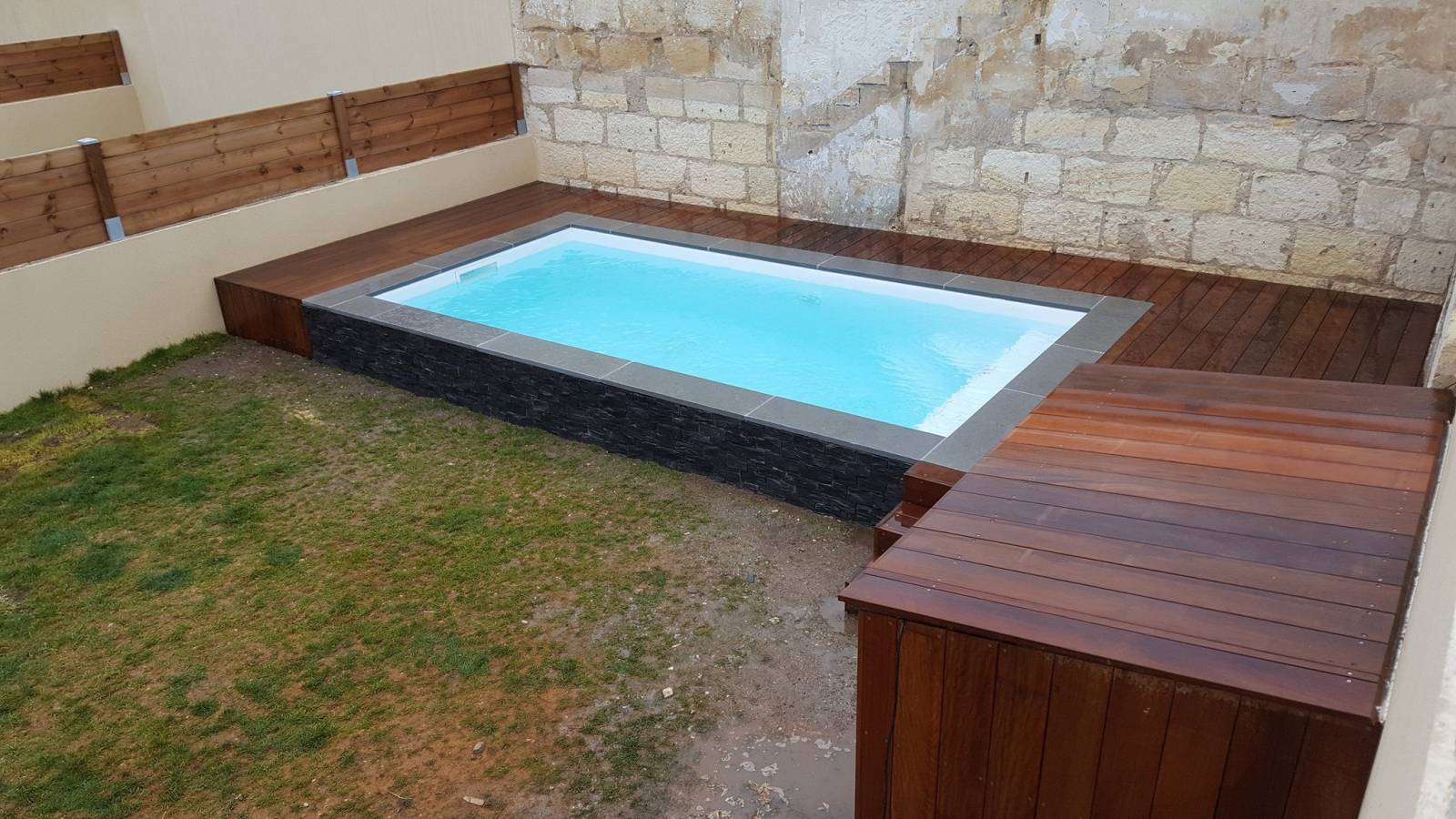 Sur ce projets Nous avons réaliser pour nos clients Bordelais une terrasse bois en Ipé sur mesure autour d'une très jolie piscine citadine.Ayant aucun accès l'approvisionnement du matériel a du ce faire par des passages dans la maison.Des plots béton 30X30 on était réaliser pour y poser la structure en Badi bois exotique pour recevoir les lames de bois en Ipé.Le local technique a également était réaliser en bois exotique Ipé.